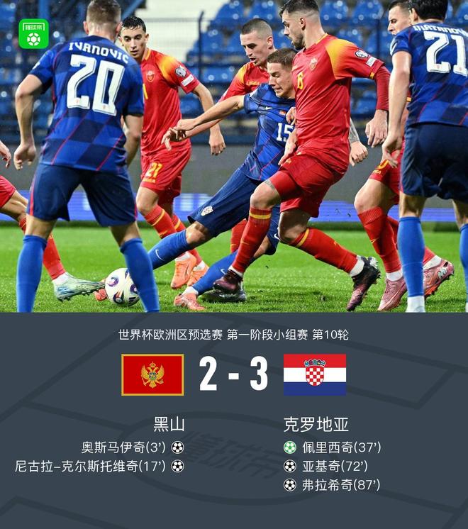 北京时间11月18日,2022年世界杯欧洲区预选赛小组赛第十轮打响。黑山和克罗地亚展开了激烈的竞争。比赛一开始,黑山就率先打破僵局,奥斯马迪奇进球确立了球队的领先优势。随后约维蒂奇助攻,科斯托维奇接球破门,将比分进一步扩大。随后克罗地亚队发起反击,佩里西奇主罚点球扭转局面。下半场,雅基奇趁机破门,帮助克罗地亚扳平比分。弗拉西奇在最后时刻打入重要进球,帮助球队取得领先。最终两队战成2-3,克罗地亚扳回一城。比赛开场3分钟,卡莱塔·卡尔送出大礼,奥斯马迪奇抓住机会破门,黑山以1-0获胜。第17分钟,尼古拉·科尔斯托维奇斜射黑山队凭借防守打进一脚远射,2-0获胜。第37分钟,雅基奇破门,佩里西奇破门,克罗地亚1-2获胜!第72分钟雅基奇再次射门,克罗地亚2-2连胜!第87分钟,弗拉西奇趁对手低级失误,怒射破门。克罗地亚让二队追击,3-2领先!美妙的时刻,两队球员入场。比赛进行到了接近2分钟的时候。马塔诺维奇寻找免费头球机会。比赛进行了三分钟,皮球高出横梁。卡莱塔·卡尔给了我一份礼物。奥斯马伊奇抓住机会破门,黑山1-0!第17分钟,科斯托维奇凭借防守远射破门,黑山2-0获胜。第37分钟,雅基奇破门,佩里西奇破门,克罗地亚1-2获胜!第72分钟,雅基奇再次射门,克罗地亚连续第二次以2-2获胜!第87分钟,弗拉西奇趁对手低级失误,怒射破门。克罗地亚让二队追击,3-2领先!球队阵容技术统计