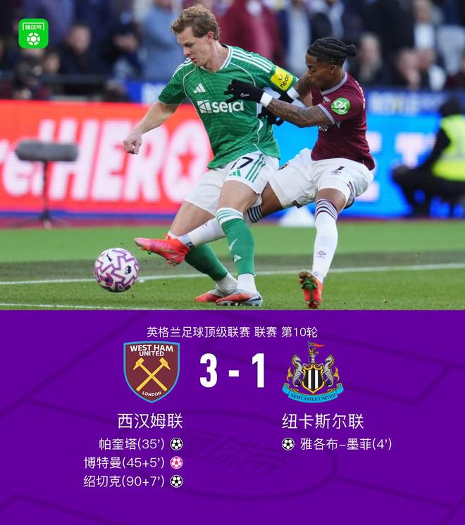 北京时间11月2日,英超第十轮比赛开始。西汉姆联队主场迎战纽卡斯尔联队。吉马良斯助攻雅各布·墨菲进球。帕奎塔为世界波打进扳平比分的进球。上半场结束前,博特曼意外打进乌龙球,西汉姆联取得领先。下半场,波茨的进球因越位被判无效,但苏切克的进球锁定了西汉姆联队的胜利。最终,西汉姆联队3-1击败纽卡斯尔联队。关键比赛进行到第五分钟,墨菲从右路突破得分。纽卡斯尔1-0领先。仅乘坐米格飞机观看英超联赛。 36分钟,世界震动!第45分钟和第5分钟,帕奎塔一脚精彩远射扳平比分,西汉姆联1-1纽卡斯尔,博特曼倒地解围打入自家球门,第90分钟和第7分钟,西汉姆联2-1纽卡斯尔锁定胜局。苏切克再进一球,西汉姆联3-1纽卡斯尔。第5分钟,墨菲解围右侧得分。纽卡斯尔1-0领先。第12分钟,鲍文禁区内倒地。裁判看了VAR,推翻了判罚。第19分钟,墨菲右路小角度尝试射门,但皮球被门将挡出。第31分钟,帕奎塔任意球直接射门。波普倒地救球。 36分钟,世界震动!帕奎塔以一记精彩的远射扳平比分。西汉姆联1-1纽卡斯尔。第45分钟和第5分钟,博特曼倒地解围,打进乌龙球。第69分钟,西汉姆联2-1纽卡斯尔。越位!波茨在第90分钟和第7分钟的进球被判无效,锁定胜局!绍切克补射破门,西汉姆联3-1纽卡斯尔队阵容技术统计【咪咕独家观看英超】