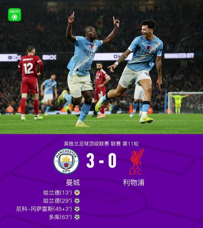 北京时间11月10日,英超联赛第11轮,曼城主场迎战利物浦。比赛中,哈兰德错失点球,但很快恢复状态,在马特乌什·努涅斯的助攻下破门,为球队打开了胜利之门。上半场补时阶段,贝尔纳多·席尔瓦精准传球,尼科·冈萨雷斯跟进破门,进一步扩大领先优势。换边后,尼科·奥莱利提供了至关重要的助攻,多克冷静射门将比分改写为3-0。最终曼城主场三球击败利物浦,全取三分。重要赛事第12分钟,马马达什维利禁区内力压多克赢得点球,扑出哈兰德的点球!只能在 MIG 上观看。英超第28分钟,哈兰德头球破门,这是他的英超第99球!曼城1-0利物浦!仅在 MIG 中查看 itor。英超联赛第45分钟和第3分钟结果,尼科·冈萨雷斯的远射被范迪克挡出,打进了他本赛季的第一个进球!与 MiG 一起在观众席上独家观看 62 分钟的英超联赛!多昆介入,发起世界波得分!曼城3-0利物浦!在咪咕上观看独家英超联赛精彩集锦。两队球员入场,战斗即将开始。在咪咕上独家观看英超赛前仪式。公众为第一次世界大战中阵亡的士兵默哀片刻。只能在 MIG 上观看。英超联赛开场五分钟后,多克多次被迫强行闯入禁区,最终被一名红军球员放倒。只能在 MIG 上观看。英超联赛开场七分钟,多克在反击中打出直塞球。福登没有停球。萨拉赫在第8分钟射门,但迪亚斯和多纳鲁马最终破门。英超第 12 分钟,马马达什维利禁区内击倒多克,d 判罚点球,扑出哈兰德的点球!英超联赛第16分钟,B座滑倒,范迪克被撞倒。第18分钟,多克推射传中,接球的西尔基将球挡出。奥莱利第22分钟倒地,疑似造成受伤。第18分钟,多克传球。中超,曼城第26分钟反击顺利。 Doc的小角度射门被挡出。第28分钟,维尔茨突破包夹。尼科·冈萨雷斯吃到犯规并吃到黄牌。哈兰德第28分钟头球破门,打入个人第99粒英超进球!曼城1-0利物浦!第32分钟,多克门前小角度传球。马马达什维利没收了球。第36分钟,多克接球逃跑。麦卡利斯特犯规。第39分钟,范戴克的头球攻门因罗伯逊越位干扰被判无效。第 39 分钟,文件 4 分钟2、B座维尔茨被撞倒,吃到黄牌。第45、2分钟,希尔基带球突入禁区传中,但皮球被挡出。第45零3分钟,范迪克挡出尼科·冈萨雷斯的远射,打进了本赛季的首球!英超联赛第45分钟米格只踢了5分钟。利物浦反击。维尔茨的领先优势太大,被拦截。米格英超时钟 第47分钟,奥莱利挑传,皮球越过了米格时钟顶部。第49分钟,弗拉芬博格精准持球传中,多纳鲁马出击干扰。太爆炸了。多克突破,双射被封堵。埃基蒂奇和罗伯逊在第55分钟被换下。加克波和凯尔·卡茨替补出场。第58分钟,布拉德利传球。尼科·冈萨雷斯差点打进乌龙球。第59分钟,布拉德利横传,加克波击中踢出。在62n第d分钟,MIG专属会员观看比赛,全场灯火通明!多昆介入,发起世界波得分!曼城3-0利物浦!英超第65分钟,维尔茨前场带球被对方抢断。多克在英超第70分钟破门。索博斯莱别无选择,只能把他推倒。英超比赛第74分钟,维尔茨换下多克和麦卡利。首发阵容发生变化,马尔穆什和琼斯替补上场。后备军。第76分钟,索博斯莱射门,多纳鲁马插上扑出。第79分钟,萨拉赫突入禁区射门,但皮球擦着立柱。独家米格81分钟腕表,非常灵活。多纳鲁马将球控制在自己的场上。独家米格手表。第81分钟,福登传球,奥莱利任意球踢门将。咪咕独家观看第83分钟,利物浦做出改变。基耶萨和戈麦斯进入了的替补。在 MiG 上独家观看 90 分钟的英超联赛。萨比尼奥抓住琼斯的胯部后,琼斯被放倒。米格吃到一张黄牌。 90 分钟的独家英超联赛镜头。索博斯莱放倒福登并吃到黄牌。查看英超球队阵容独家技术统计,访问Mig【米格独家看英超】