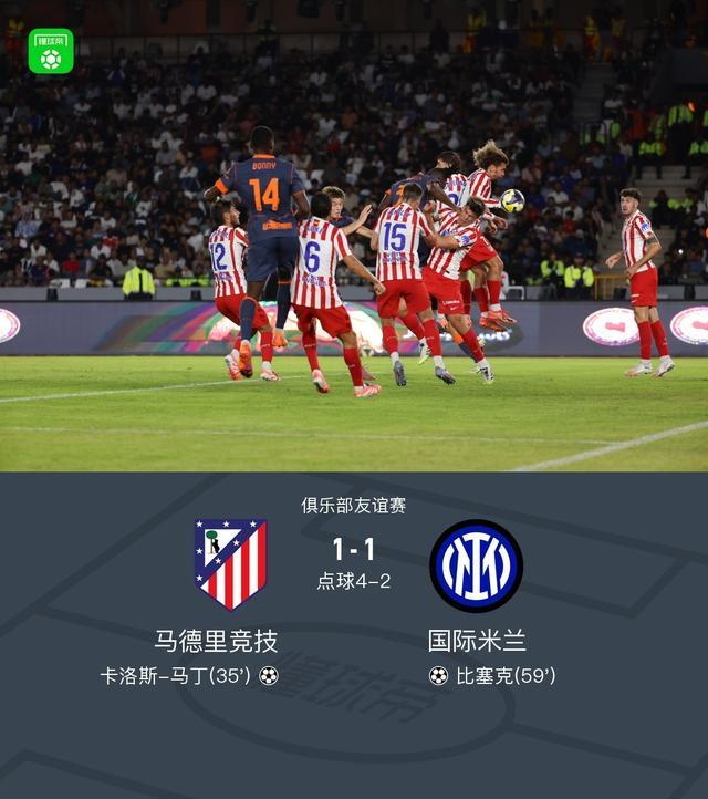 北京时间10月11日,马德里竞技队与国际米兰队进行了一场友谊赛。上半场,卡洛斯·马丁在禁区内巧妙转身射门近角。下半场,姆希塔良开出角球,比塞克头球破门将比分扳平。马德里竞技点球大战4-2迎战国际米兰,总比分5-3获胜。关键时刻:第35分钟,卡洛斯·马丁禁区内巧妙转身射门入近角。马德里竞技1-0国际米兰。第59分钟,姆希塔良开出角球,比塞克头球破门,国际米兰1-1马德里竞技。双方球员的亮点。我们一进体育场,比赛就开始了。第3分钟,博尼禁区内射门,但皮球被穆索挡出。第10分钟,格列兹曼进球,但越位在先被判无效。第15分钟,阿尔马达射门偏出,但皮球被马丁内斯挡出。 2'8 第8分钟,阿尔马达门前射门但皮球被马丁内斯挡住。国米第52分钟换人,博沃因伤离场,卡茨马斯基上场。第70分钟,卡洛斯·希门尼斯远射,但皮球被马丁内斯挡出。 76' 第79分钟,阿博尼福突入禁区直接射门打在门将身上。球被穆索挡出。第79分钟,赫苏斯·巴里奥斯插上射门,但皮球被马丁内斯挡出。马德里竞技队在第84分钟做出改变。随着科蒂斯因伤缺阵,普利奇加入了球队的阵容。技术统计