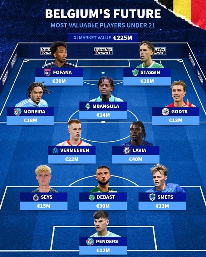 北京时间10月12日,德胡安计算出最有价值的比利时U21球员最佳11人阵容。 Lavia以4000万欧元的身价位居榜首。马利克·福法纳(Malik Fofana)、姆班古拉(Mbangula)、韦尔穆伦(Vermeulen)、德巴斯托(De Basto)和彭德斯(Penders)都在其中。德国为比利时U21做出最昂贵的11人转会:门将彭德斯(斯特拉斯堡)1200万欧元,后卫马特·斯梅茨(亨克)1300万欧元,德巴斯托(Sport CP)3000万欧元,华金·塞(布鲁日)1500万欧元,中场拉维亚(切尔西)4000万欧元,韦尔默伦(马赛) 220 00,000 欧元, 米卡·加茨(阿贾克斯)1300万欧元,姆班古拉(云达不来梅)1400万欧元,迭戈·莫雷拉(斯特拉斯堡)1800万欧元,前锋斯塔辛(圣艾蒂安)1800万欧元,马利克·福法纳(里昂)3000万欧元。总金额:2.25亿欧元【在MIG上独家观看英超联赛】